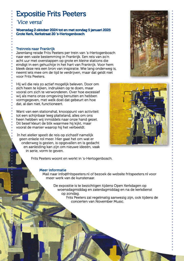 Op zaterdag 12 en zondag 13 september exposeer ik, met name kleiner werk, op de kunstbeurs ‘Art Eindhoven’ in het industriële Klokgebouw op Strijp S in Eindhoven. Voor belangstellenden: stuur een mail naar info@fritspeeters.nl dan regel ik de toegangskaart(-en). Je krijgt dan een mail met een link en een 100% kortingscode.